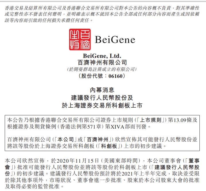 昨日(11月16日),百济神州发布公告称,董事会于11月15日(美国东部时间)批准可能发行人民币股份,并将该等股份于科创板上市的初步建议,预计将于2021年上半年完成。