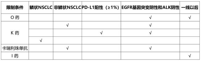 根据临床试验的设计不同,几款已上市的PD-1/PD-L1药物获批的适应症也有所差异,这些限制因素是由于疾病分期、病理亚型、肿瘤标记物的不同而异的。部分PD-1/PD-L1单抗治疗被限制用于化疗、靶向治疗药物治疗失败的患者,而非用于一线治疗。通常,为了提高临床试验的成功率,EGFR基因突变阴性和ALK阴性、PD-L1阳性(≥1%)等被设置为患者入组的筛选条件。