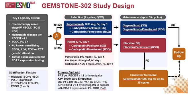 在ESMO ASIA 2020上,上海市肺科医院肿瘤科主任周彩存教授首次公布了III期研究(GEMSTONE-302)的详细数据。在官方早前的报道可以看出,该药在最早临床方案设计的时候,是全球首个抗PD-L1单抗联合化疗作为一线治疗在IV期鳞状和非鳞状NSCLC患者中的随机双盲III期临床试验。