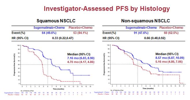 截至2020年6月8日,入组的479例患者分别接受舒格利单抗联合化疗对比安慰剂联合化疗,在包含鳞状和非鳞状NSCLC的所有患者中,研究者评估的中位PFS由对照组的4.9月提高到7.8月,风险比HR =0.5 (95% CI: 0.39, 0.64),p<0.0001;盲态独立中心审查委员会(BICR)评估的中位PFS由对照组的4.9月提高到8.9月,风险比HR=0.54(95%CI:0.41,0.70), p<0.0001。其中:<>