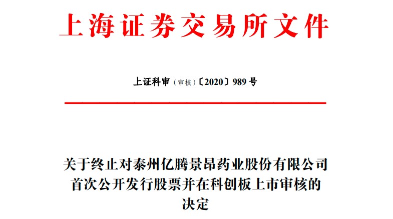 12月3日,上海证券交易所发布《关于终止对泰州亿腾景昂药业股份有限公司首次公开发行股票并在科创板上市审核的决定》,根据《上海证券交易所科创板股票发行上市审核规则》第六十七条的有关规定,本所决定终止对你公司首次公开发行股票并在科创板上市的审核。