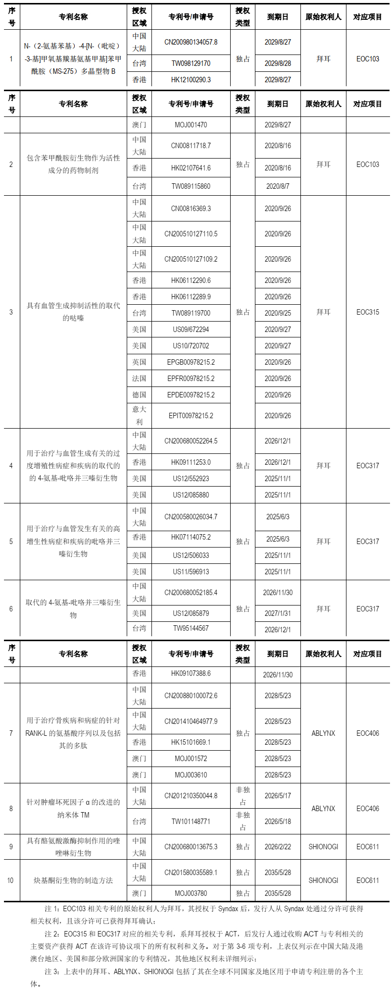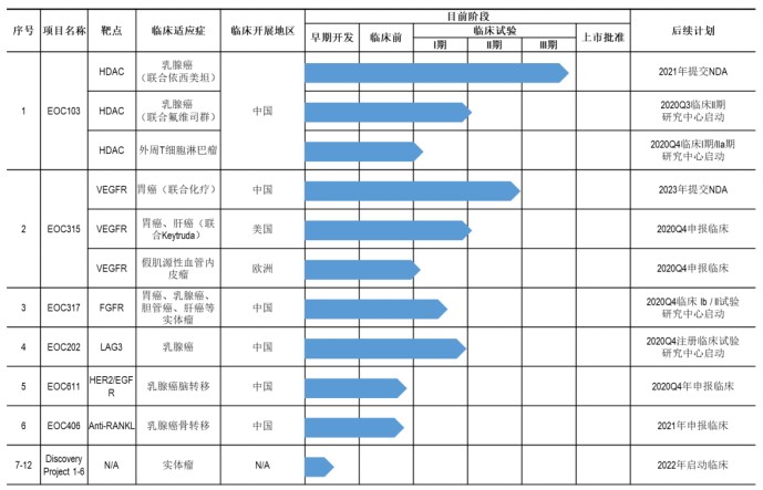 招股书显示,亿腾景昂从美国合作方 Syndax 引进恩替诺特项目的授权(内部代号 EOC103)已进入临床III 期研究,预计 2020 年年底或者 2021 年初完成试验。另一个内部代号为EOC315的项目(收购自 ACT 与专利相关的主要资产,并获得了甲磺酸特拉替尼的全球权利)于 2018 年下半年完成临床 I期桥接试验,目前正在进行国内临床 II 期试验。