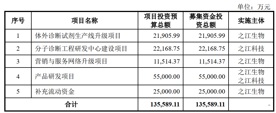 据此前之江生物招股说明书(注册稿)显示,本次拟公开发行股票不超过 4,867.6088 万股,募集资金13.6亿元,主要用于体外诊断试剂生产线升级项目、分子诊断工程研发中心建设项目、营销与服务网络升级项目、产品研发项目和补充流动资金。
