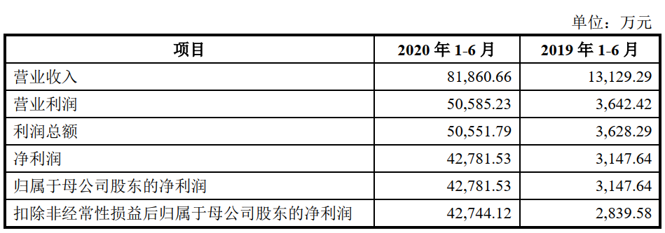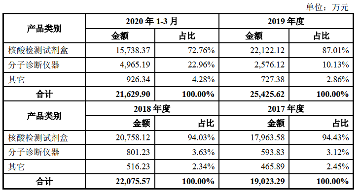 2020年1-6月,其新冠检测试剂盒销售收入达到47,721.41万元(审阅数),核酸提取试剂盒销售收入达到6,039.60万元(审阅数),合计占主营业务收入比重为66.22%。