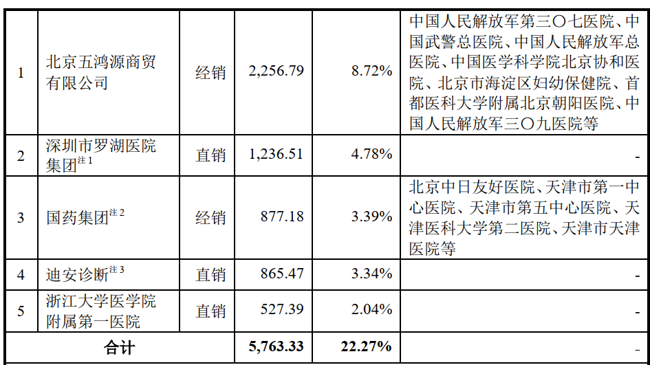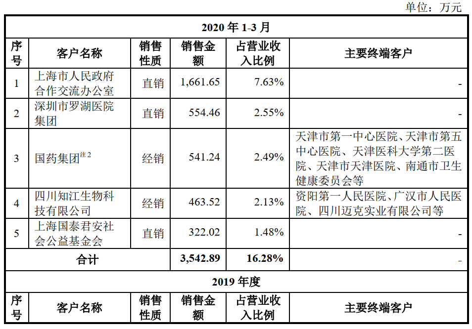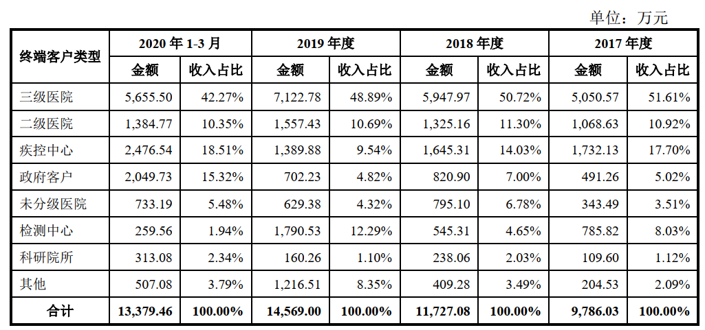 2017 、2018 、2019、2020 年度,终端客户为三级医院、二级医院、疾控中心、政府客户的合计收入占全部经销收入比例分别为 85.25%、83.05%、 73.93%、 86.45%。