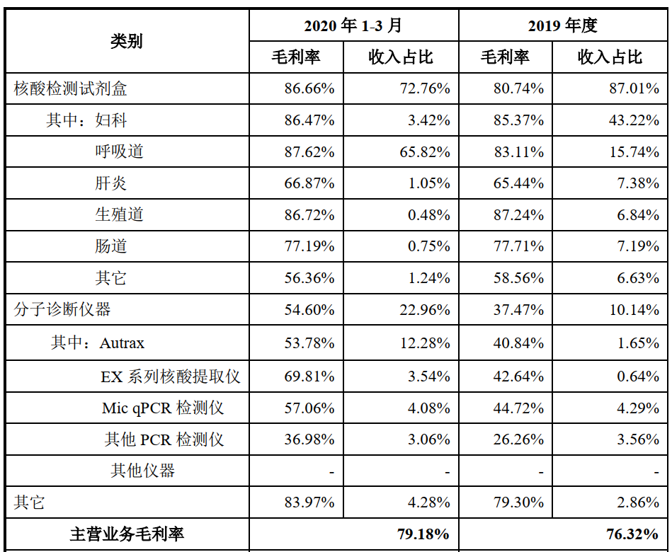 根据其报告期内主营业务毛利率的构成可以看到,同样是核酸检测试剂盒占据大头。