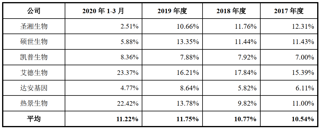 2017-2019年,之江生物的研发费用分别为2010.16万元、1992.45万元、2340.50万元,2020年一季度为690.71万元,研发费用率分别为10.43%、8.88%、9.04%、3.17%,除20230年第一季度,其他基本与行业平均水平相当。