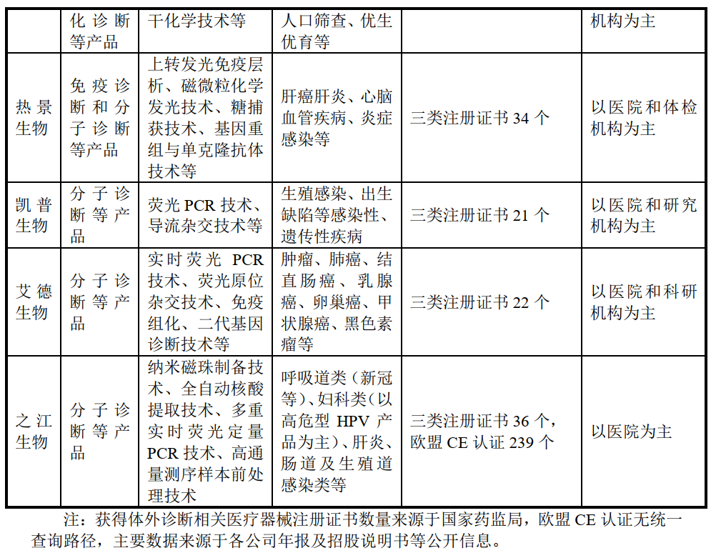 全球分子诊断行业不断发展,根据华夏基石《中国医疗器械上市公司发展白皮书-体外诊断篇(2019)》,预计到2020年,分子诊断市场规模达到125亿元,年复合增长率预计为17.01%。目前国内主要涉及分子诊断的企业除之江生物外,还包括达安基因、圣湘生物、硕世生物、热景生物、凯普生物、艾德生物等。