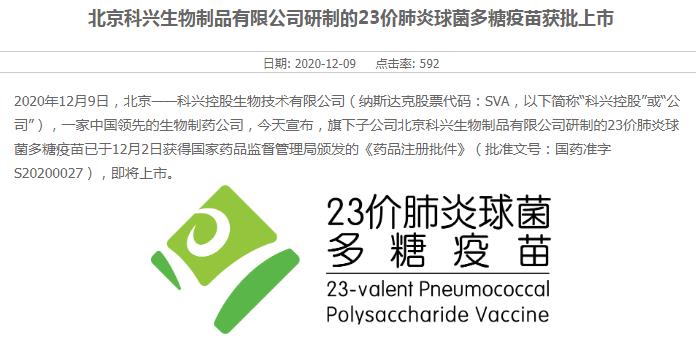 昨日(12月9日),科兴生物在其官网宣布,旗下子公司北京科兴生物制品有限公司研制的23价肺炎球菌多糖疫苗已于12月2日获得国家药监局颁发的《药品注册批件》(批准文号:国药准字S20200027),即将上市,这也是获批的第四款国产23价肺炎疫苗。