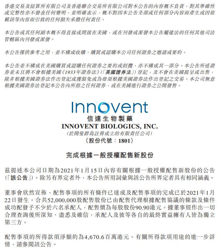 根据此前发布的公告,信达生物此次配售事项所得款项净额将主要用于加快投资及开发公司全球领先创新产品的多项临床试验计划;拨付潜在产品授权及可能进行併购活动的资金;及进一步扩大产能;及营运资金及其他一般企业用途。