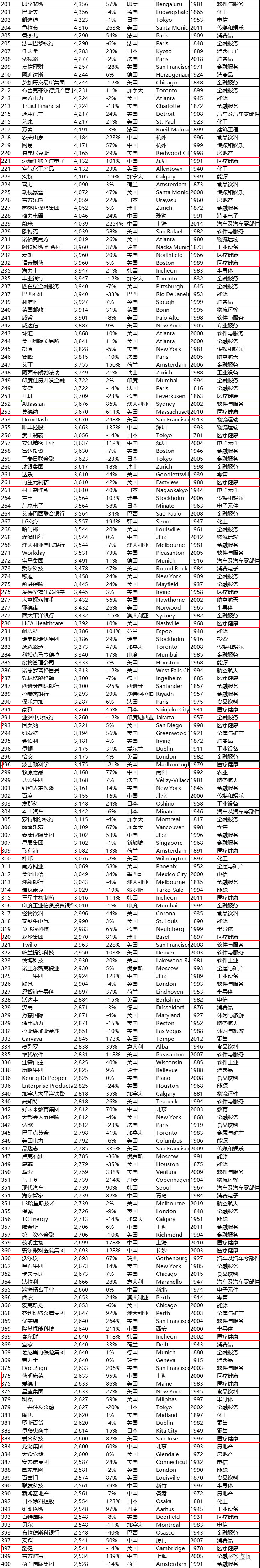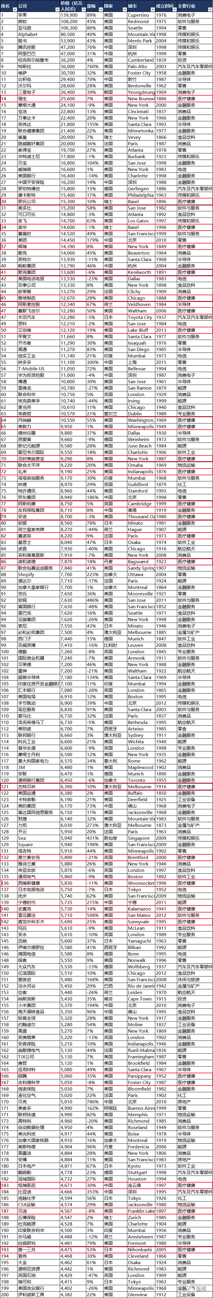 从行业分布来看,美国以242家企业上榜排名第一,其次是中国51家,日本30家,法国和英国各21家。美国上榜企业总价值增加了27%,中国上榜企业总价值增加了73%。