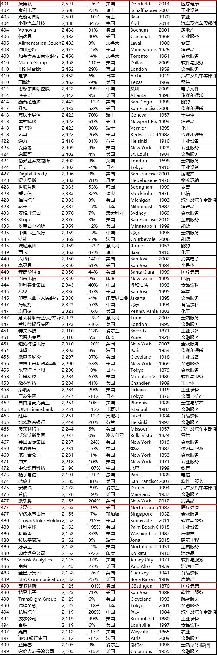 从行业分布来看,医疗健康类有54家企业上榜,仅次于金融服务业,在上榜的医疗健康类企业中,强生以价值2.56万亿人民币位居榜单第14位,罗氏以1.53万亿排第30位,诺华以1.46万亿人民币排第34位,其中,有5家中国医疗企业上榜,包括恒瑞医药、迈瑞医疗、药明生物、爱尔眼科医院、药明康德等,分别排名183位、221位、359位、360位、以及375位。