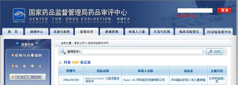 据国家药监局药评中心(CDE)最新公示,拜耳(Bayer)公司以化学药品第1类提交的selitrectinib口服混悬液用粉末临床试验申请获得默示许可,拟开发用于NTRK融合的成人和儿童肿瘤。