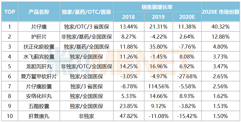 据米内网数据显示,TOP1药企已被片仔癀牢牢稳住,市场份额逐年攀升,其在肝炎用药领域的主要产品包括了片仔癀、片仔癀胶囊、茵胆平肝胶囊3个独家产品以及护肝片,在肝炎用药TOP10产品中7个为独家,片仔癀占了两个席位,片仔癀(锭剂)最近三年的销售额增速保持在双位数水平,2020年预计市场份额上涨至40.32%。