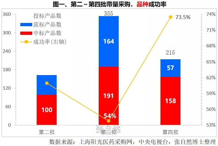 本次共有215个品种进行了报价,最终158个中选,中选率73.5%,是历次国采最高的一次,第二批和第三批分别中标100个和191个品种,中标率分别为61%和54%,本次之所以中标率最高,一是因竞品相对少且允许中标的名额多,第三批时竞品最多达30个(二甲双胍口服常释剂型),最多只允许8个中标,而本批最多的只有16个(注射用帕瑞昔布钠)品种竞争、最多却可允许10家中标,第二批时中标名额就更少,最多只允许6家中标;另外,鉴于集采全覆盖已进入倒计时,不但中选价成为同品种的价格天花板,而且不中标的话还使用受限,所以占集采主流的本土企业参与集采的积极性和诚意都很高,另外,本批竞品少反而中选名额多的另一原因,可能也是为落实“要兼顾企业合理利润”的会议精神。