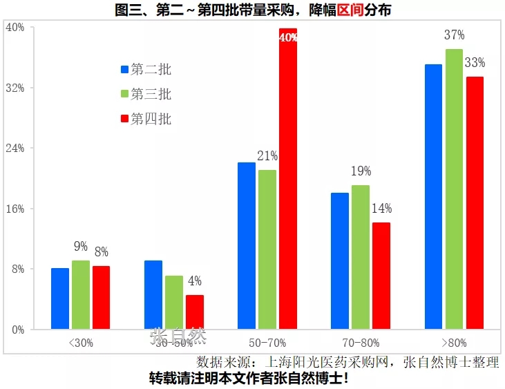 笔者3天前(2月1日)发表的《后天开标,第四批带量采购报价参考》一文已做过分析,纵观前几次集采,降价主要集中在50%-70%和>80%这个区间,本次则更是如此,本次降幅在50%-70%之间的就多达62个,占了拟中选总品种数158个的40%,其次降幅主要集中在80%以上,降幅在80%以上的有52个品种,占了33%。
