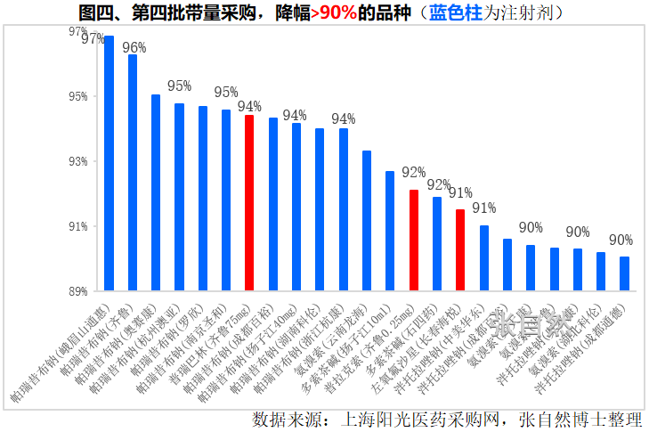 第三批集采时,降幅>90%的品种数比本批还多出8个,共32个,降幅最大的高达98.72%(石药的美金刚),本次降幅最大的是峨眉山通惠药业的注射用帕瑞昔布钠,降幅为96.82%。