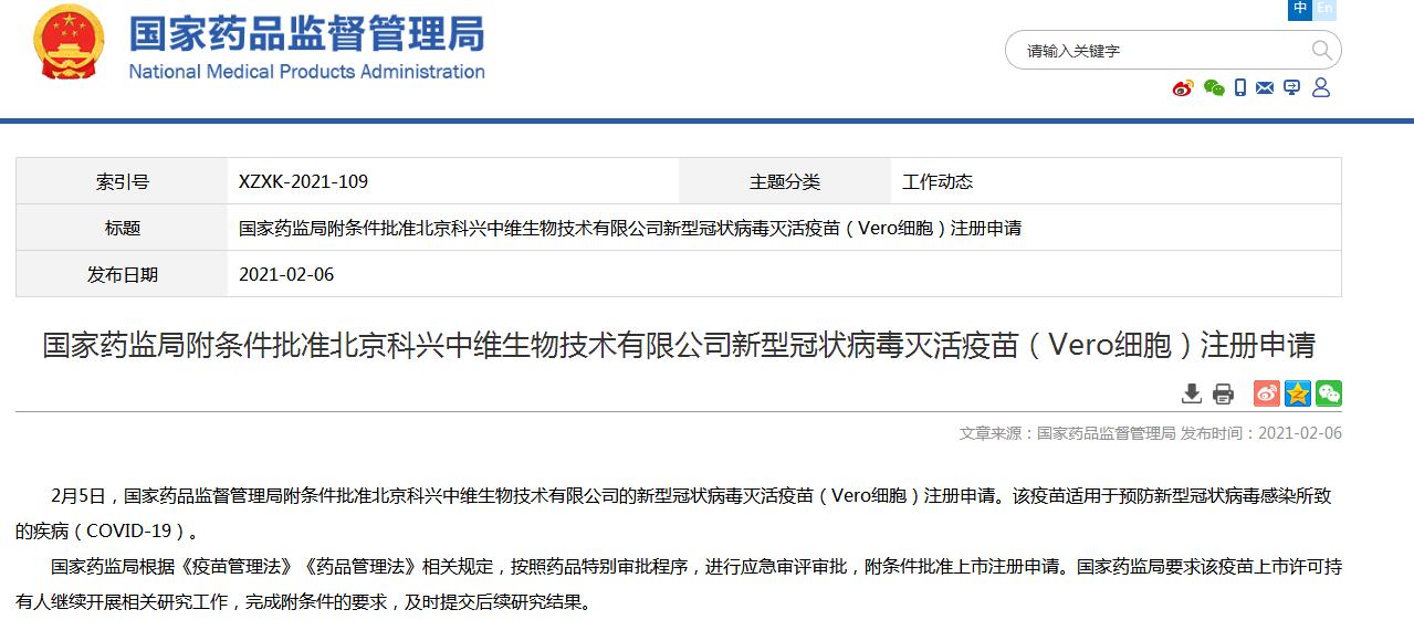 今日(2月6日),据国家药监局官网信息,已附条件批准北京科兴中维生物技术有限公司(以下简称科兴生物)的新型冠状病毒灭活疫苗(Vero细胞)即克尔来福疫苗的注册申请,适用于预防新型冠状病毒感染所致的疾病(COVID-19)。