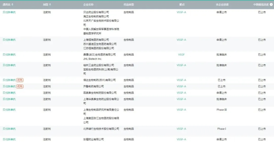 部分处于上市申请和临床试验的贝伐珠单抗注射液企业(图片来源:医药魔方PharmaGO数据库)