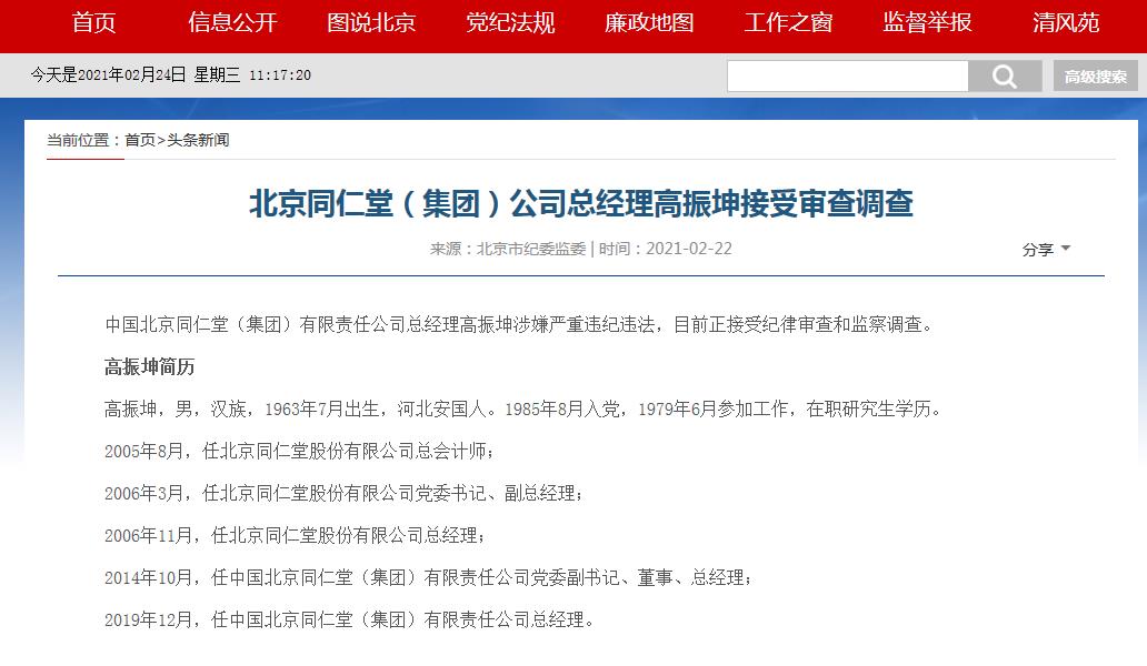 上述消息称,中国北京同仁堂(集团)有限责任公司总经理高振坤涉嫌严重违纪违法,目前正接受纪律审查和监察调查。