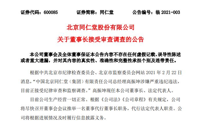 随后,同仁堂发布公告确认了该消息,并称目前公司生产经营一切正常,根据《公司法》《公司章程》有关规定,公司将尽快召开董事会会议推举一名董事代行董事长职务,代行法定代表人职责。