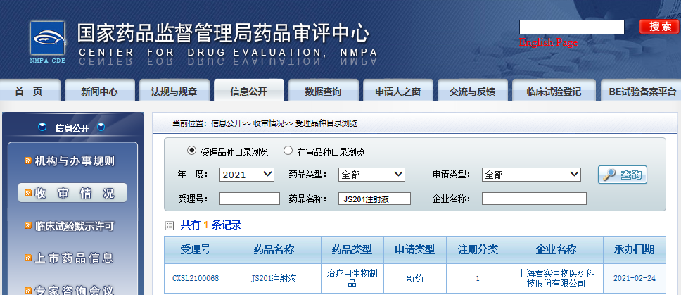2021年2月24日,根据国家药监局药品审评中心(CDE)官网,君实生物的“JS201注射液”临床试验申请获得受理(受理号:CXSL2100068)。这是全球首个PD-1/TGF-β双抗,国内外目前尚无同类靶点产品获批上市。