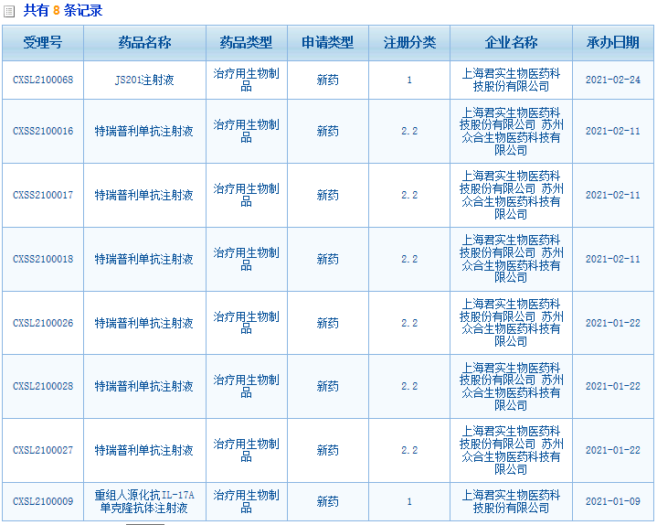 2021年,君实生物已向CDE公开8项申请,具体如下: