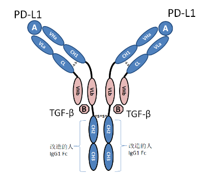 PD-L1/TGFβ为热门的双抗研发领域之一,从药物的设计上来看,靶向PD-L1和TGF-β的双重功能融合蛋白既能抑制PD-L1蛋白配体、发挥一般PD-1抗体的功能,又能抑制TGF-β通路,减轻对免疫细胞的抑制、降低癌症转移的机会,双靶点协同提升免疫细胞对肿瘤细胞的杀伤效果。较PD-1单抗药物而言,这种双功能蛋白可以极大地提升药物的有效率,并降低PD-1单抗与其他药物联合用药的不良反应。