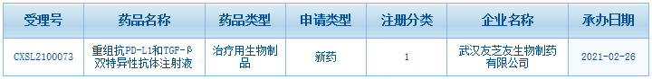 2021年2月26日,武汉友芝友生物制药有限公司(以下简称“友芝友生物”)自主研发的重组抗PD-L1和TGF-β双特异性抗体注射液(代号:Y101D)按“治疗用生物制品1类新药”递交的临床试验申请已获得国家药监局药品审评中心正式受理,受理号为:CXSL2100073。该产品上市后将用于治疗局部晚期或转移性肿瘤。