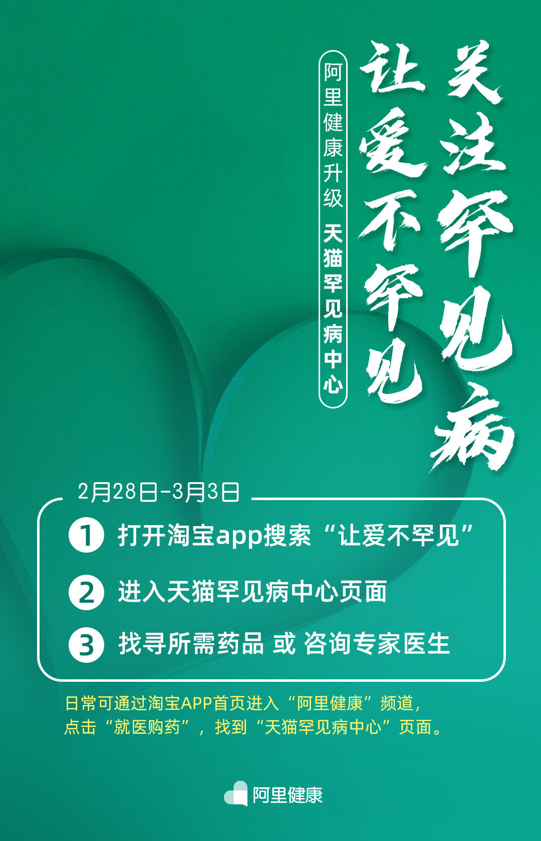 2月28日-3月2日,罕见病患者在淘宝APP搜索“让爱不罕见”,即可进入“罕见病中心”。用户可以通过“全球找药联盟”找寻稀缺药,也可直接在线咨询全国三甲医院专家。日常也可通过淘宝APP首页进入“阿里健康”频道,点击“就医购药”,就能找到“罕见病中心”页面。?