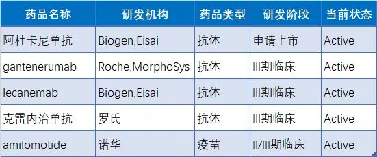目前有多个公司的同类产品在临床研发阶段,适应症为阿尔茨海默病。根据医药魔方NextPharma数据库,共检索到5款已处于上市申报或III期临床阶段靶向Aβ蛋白药物。
