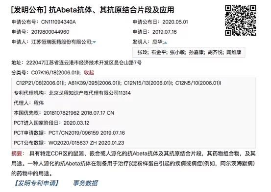 根据国家知识产权局官网披露,可判断恒瑞医药SHR-1707是抗Abeta(Aβ,β-淀粉样蛋白)抗体。这是目前恒瑞唯一公布的一款靶向β淀粉样蛋白(Aβ)的发明。