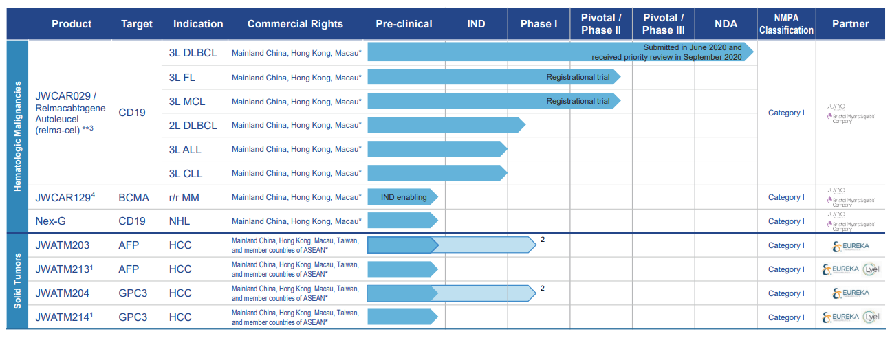 目前,药明巨诺共有7款细胞免疫疗法候选产品,主要集中于实体瘤治疗,血液癌症产品研发进度相对较快,核心产品JWCAR029在国内已进入上市前阶段。有报道称JWCAR029在中国进行了一些基于商业化考虑的工艺优化,前身JCAR017是CD4和CD8细胞分离出来使用两条产品线生产,最后按照1:1比例混合回输到病人体内,而在中国JWCAR029改良为提取CD4和CD8细胞后混合不做分离,在一条生产线上培养、生产后,再一起回输到病人体内。