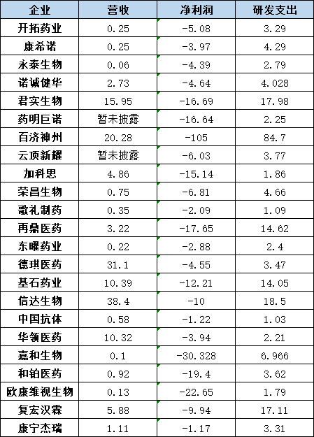 分别是君实生物、百济神州、再鼎医药、基石药业、复宏汉霖,研发支出分别为17.98亿元、84.7亿元、14.62亿元、14.05亿元、17.11亿元。