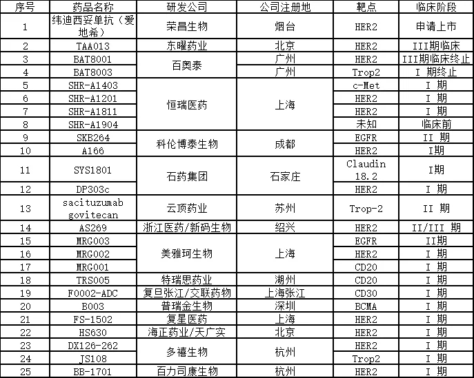 此外,国内还有二十多种处于不同阶段临床试验中的ADC药物正在开发中,包括东曜药业、恒瑞医药、科伦药业、云顶新耀、浙江医药等多个公司有产品已经进入临床阶段,除了大多数针对HER2靶点外,其他靶点包括c-Met、EGFR、Trop-2、CD20、BCMA等。
