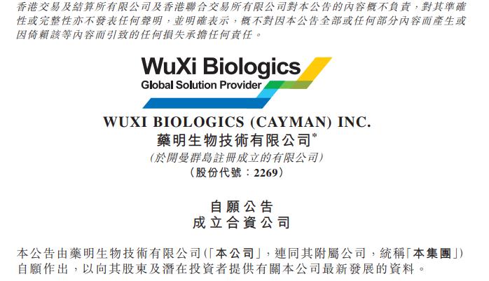 日前,药明生物发布公告称,该公司计划与药明康德的附属公司合全药业成立合资公司WuXi XDC (Cayman) Inc.(WuXi XDC),此须待(其中包括)药明康德股东批准后方可作实。