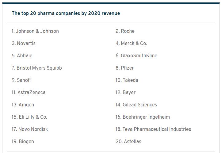 根据榜单,强生(Johnson & Johnson)以825.84亿美元的收入占据榜首,罗氏以约合616.77亿美元(583.23亿瑞士法郎)位居第二,诺华以486.59亿美元排名第三,其后依次是默沙东(480亿美元)、艾伯维(458亿美元)、葛兰素史克(437.7亿美元)、百时美施贵宝(425.2亿美元)、辉瑞(419亿美元)、赛诺菲(410.8亿美元)、武田(292.5亿美元)、阿斯利康(266.17亿美元)、拜耳(257.1亿美元)、安进(254.24亿美元)、吉利德(246.89亿美元)、礼来(245.4亿美元)、勃林格殷格翰(229.28亿美元)、诺和诺德(194.11亿美元)、梯瓦(166.6亿美元)、渤健(134.4亿美元)、安斯泰来(115.1亿美元)。