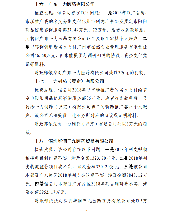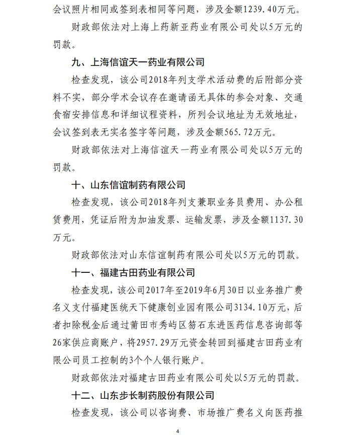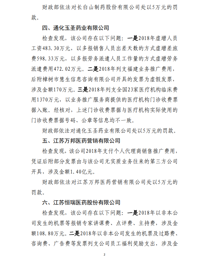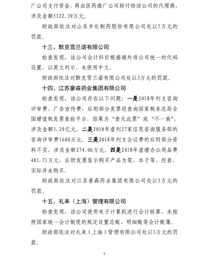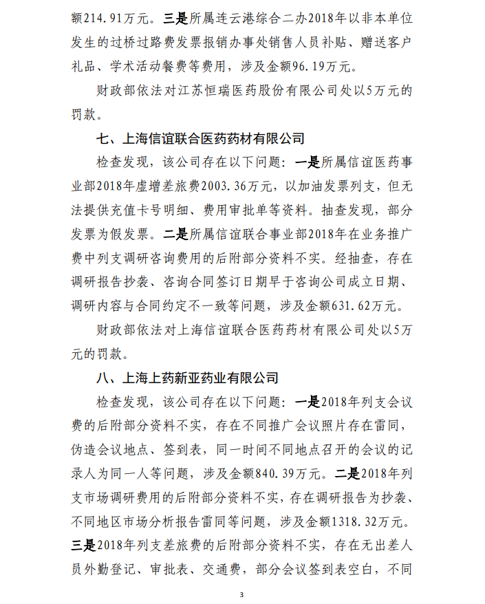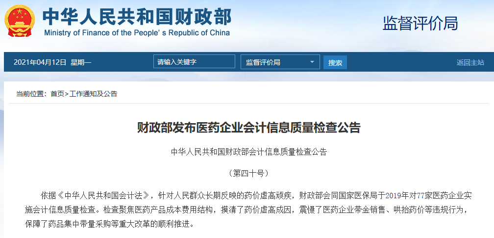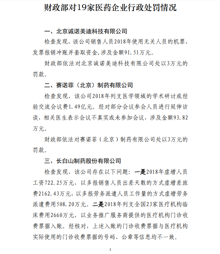 刚刚,财政部发布《中华人民共和国财政部会计信息质量检查公告(第四十号)》,正式通报了医药企业会计信息质量检查的结果。结果显示,77家药企普遍存在使用虚假发票套取资金体外使用等违规行为,19家医药企业受到了3到5万元的行政处罚。恒瑞医药、步长制药、赛诺菲等药企均在处罚之列。