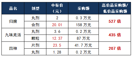 例如,中标价20.01元的归脾合剂,采购额158万元,而中标价为2元的归脾丸同期采购额仅0.3万元,高价中标品采购额是低价中标品的527倍。