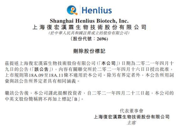 日前,复宏汉霖(02696.HK)宣布自本周五(4月23日)起正式将“B”标记将从股票代码中移除。