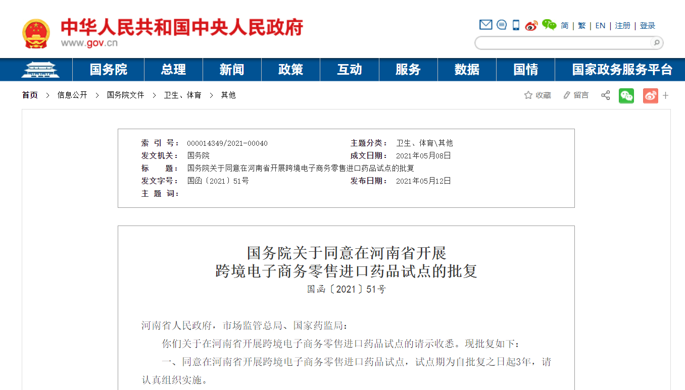 近日,国务院发布《关于同意在河南省开展跨境电子商务零售进口药品试点的批复》(以下简称《批复》)称,同意河南试点跨境电商零售进口药品,试点期为自批复之日起3年。