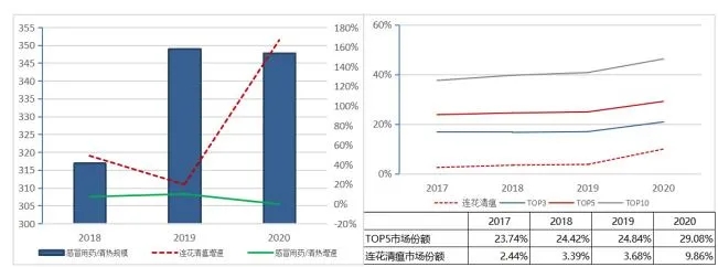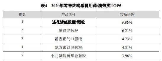 中康资讯数据显示,连花清瘟产品在零售终端感冒用药/清热类产品市场份额由2017年的2.44%增长至2020年的9.86%,成为零售市场感冒用药中成药第一大品牌。