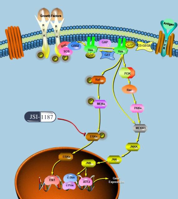 ERK信号通路在肿瘤发生和诸如细胞周期进程、细胞增殖、迁移、生存、分化、衰老、代谢、蛋白质合成和血管生成等关键细胞过程的调控中发挥着关键作用。ERK激酶作为节点通过磷酸化激活下游细胞质和核靶点来控制ERK信号通路的输出,促进细胞周期调节和负反馈机制形成。在大约30%的人类癌症中,ERK通路通过RAS、 RAF或MEK的突变而异常激活,因此该信号通路一直是癌症靶向治疗的热门研究领域。