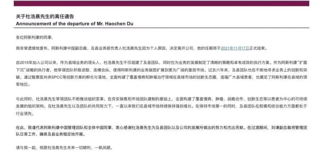 近日,阿斯利康内部发布公告,中国副总裁、及县业务部负责人杜浩晨因为个人原因,决定离开公司,任期将于2021年11月17日正式结束。