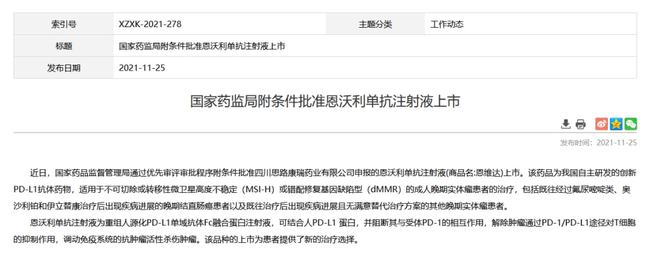 近日,中国国家药品监督管理局(NMPA)最新公示,康宁杰瑞、思路迪医药以及先声药业战略合作的1类生物药恩沃利单抗注射液(KN035)已获得附条件批准,(批准文号:国药准字S20210046),用于治疗微卫星高度不稳定(MSI-H)晚期直肠癌和MSI-H晚期胃癌及其DNA错配修复功能缺陷(dMMR)晚期实体瘤。