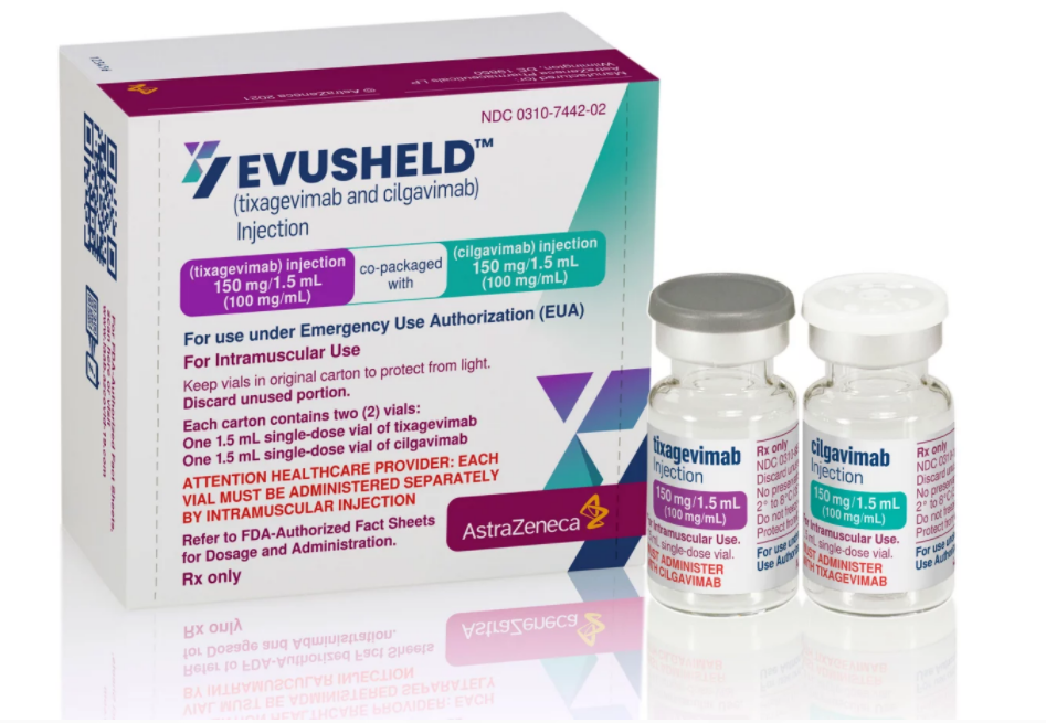 Evusheld是两种单克隆抗体(tixagevimab和cilgavimab)的组合疗法,连续两次单独的肌内注射给药(每个单克隆抗体一次注射,立即连续给药)。这两种抗体分别附着在SARS-CoV-2的刺突蛋白上,阻止病毒进入人体细胞并引起感染。由于tixagivimab和cilgavimab与刺突蛋白上不同的非重叠位点结合,因此它们比单独使用任何一种更有效。