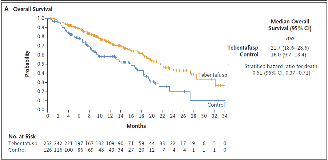 此次获批基于随机3期IMCgp100-202临床试验(NCT03070392)数据。试验中,共378例患者按2:1的比例随机分配至研究组(tebentafusp)或对照组(82% Keytruda、12% Yervoy、6% Dacarbazine)。临床结果显示,tebentafusp显着延长了总生存期(OS)、将死亡风险降低了49%(HR=0.51[95%CI:0.37-0.71];p<0.0001)。tebentafusp治疗组1年总生存率为73.2%,而对照组为58.5%。此外,tebentafusp治疗将疾病进展或死亡风险(PFS)显着降低了27%(HR=0.73)。这是在实体瘤中获得生存获益数据的首个双特异性TCR疗法。