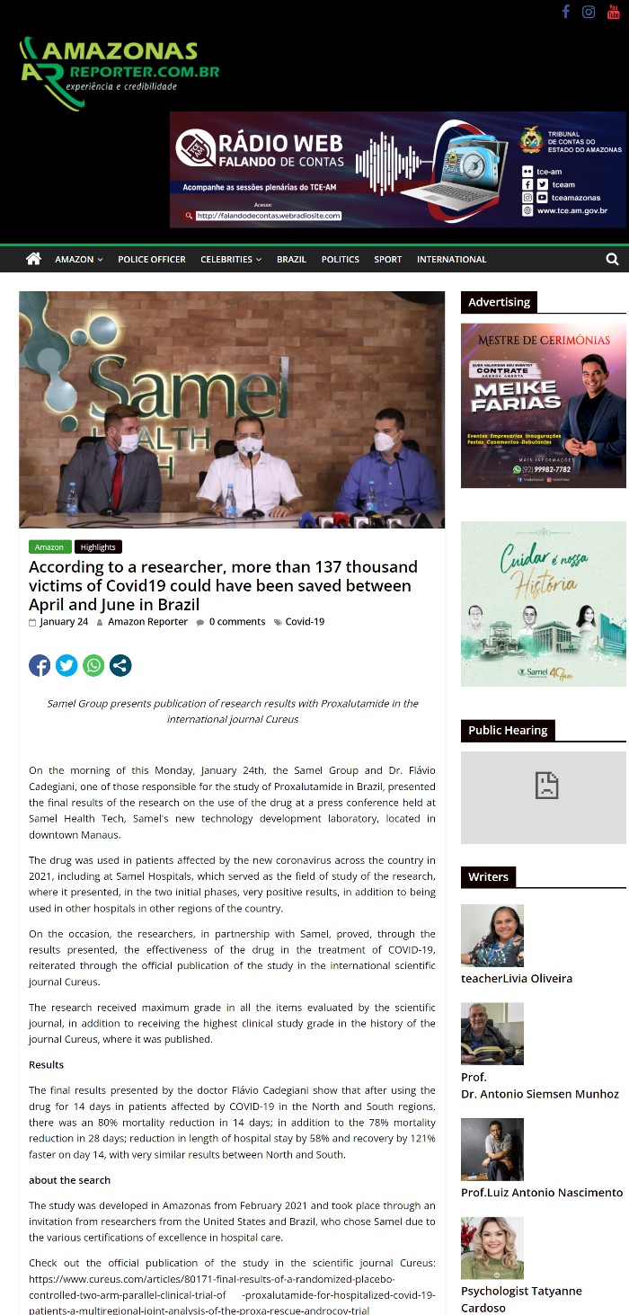 当地时间2022年1月24日,巴西Samel医院和Flávio Cadegiani医生在玛瑙斯举行了新闻发布会,会上展示了普克鲁胺在巴西治疗重症新冠患者研究者临床试验的最终亮眼数据。Samel医院和Flávio Cadegiani医生是此项试验的临床中心医院和主要研究者之一。
