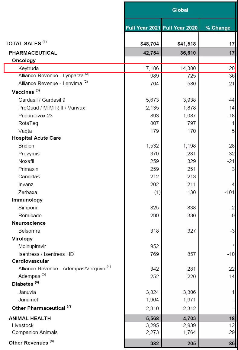2月3日,默沙东公布2021年业绩,全年营收487.04亿美元,同比增长17%,其中,制药业务收入427.54亿美元,同比增长17%,当家产品Keytruda成为绝对的营收主力,以171.86亿美元(以最新汇率计,约合人民币1125.8亿)雄踞默沙东所有产品营收榜首,相较于去年的143.80亿美元,实现了17%的增长,且逐步向“药王”修美乐的销售规模靠近(修美乐2021年全球收入达206.94亿美元),有专业机构预测Keytruda2022年销售规模预计将达到195亿美元。