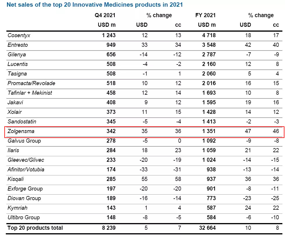 近日,诺华公布了其2021年业绩,旗下有14款产品销售业绩迈入“10亿美元俱乐部”,其中,基因疗法Zolgensma销售收入达到13.51亿美元,同比增长46%,主要得益于在欧洲和新兴市场的扩张以及美国市场的稳定销售。